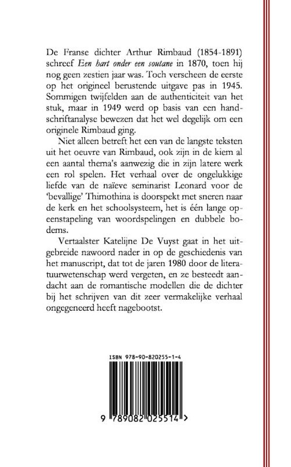 De Franse dichter Arthur Rimbaud (1854-1891) schreef 'Een hart onder een soutane' in 1870, toen hij nog geen zestien jaar was. Toch verscheen de eerste op het origineel berustende uitgave pas in 1945. Sommigen twijfelden aan de authenticiteit van het stuk, maar in 1949 werd op basis van een handschrift-analyse bewezen dat het wel degelijk om een originele Rimbaud ging.