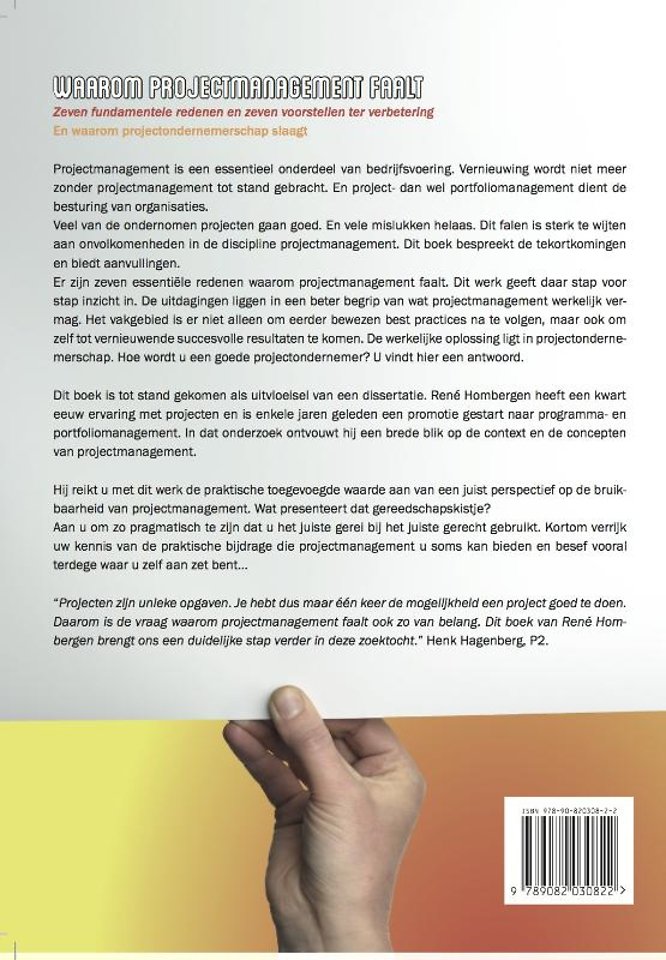 Projecten slagen of mislukken zo oud als zij zijn. Sommige piramiden lukten, sommige kanalen kwamen nooit af. Projectmanagement is een jonge discipline. En ook projectmanagement faalt regelmatig. In dit boek somt René Hombergen zeven basale redenen op waarom het vakgebied tekortschiet. Hij verkent en verklaart elk tekort. En hij noemt zeven oplossingen. Projectmanagement hoeft niet meer de reden te zijn dat uw projecten niet tot het succes komen dat u er van mag verwachten.
