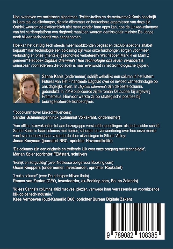 Hoe overleven we racistische algoritmes, Twitter-trollen en de metaverse? Kanis beschrijft in klare taal de alledaagse, digitale dilemma's en herkenbare ergernissen van deze tijd. Ontdek waarom de platformbitch niet meer zonder haar apps kan, hoe de Linked-influencer van het carrièreplatform een dagboek maakt en waarom demissionair minister De Jonge nooit bij een tech-bedrijf was aangenomen.