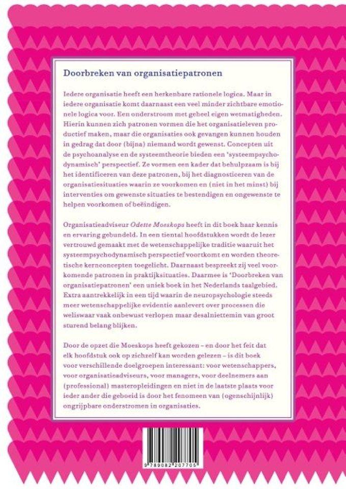 Organisatieadviseur Odette Moeskops heeft in dit boek haar kennis en ervaring gebundeld. In een tiental hoofdstukken wordt de lezer vertrouwd gemaakt met de wetenschappelijke traditie waaruit het systeempsychodynamisch perspectief voortkomt en worden theoretische kernconcepten toegelicht. Daarnaast bespreekt zij veel voorkomende patronen in praktijksituaties. Daarmee is 'Doorbreken van organisatiepatronen' een uniek boek in het Nederlands taalgebied. Extra aantrekkelijk in een tijd waarin de neuropsychologie steeds meer wetenschappelijke evidentie aanlevert over processen die weliswaar vaak onbewust verlopen maar desalniettemin van groot sturend belang blijken.