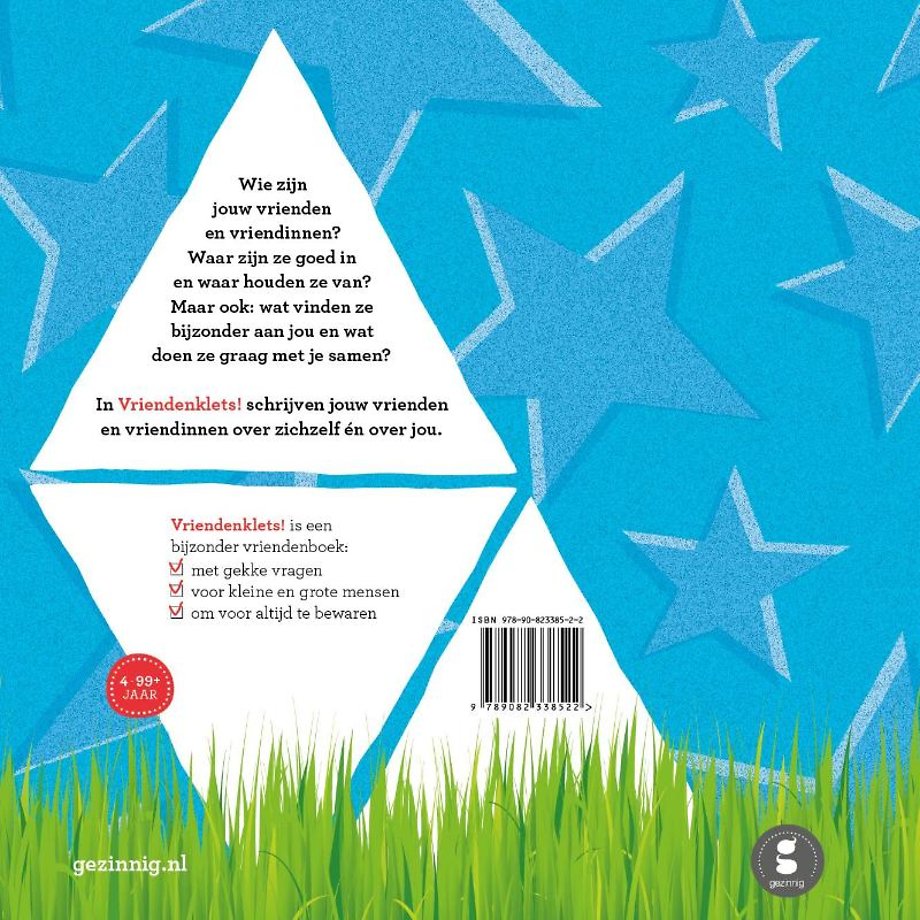Vriendenklets! is een bijzonder vriendenboek voor klein en groot (4-99+). De invuller noteert niet alleen antwoorden over zichzelf, maar ook over de eigenaar van het boek en over de vriendschap tussen beide personen.