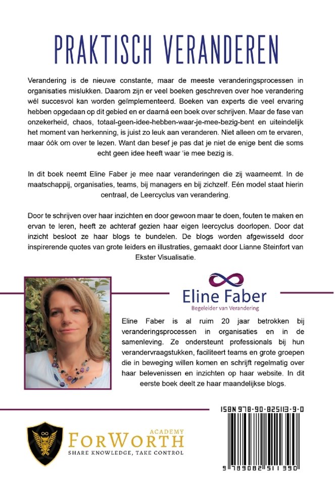 In dit boek neemt Eline Faber je mee naar veranderingen die zij waarneemt. In de maatschappij, organisaties, teams, bij managers en bij zichzelf. Eén model staat hierin centraal, de Leercyclus van verandering.