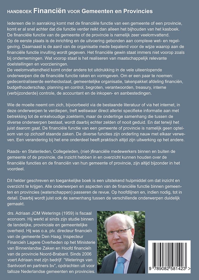 Met dit handboek wordt Raads- en Collegeleden, niet-financiële medewerkers (management en beleidsmakers) binnen de gemeenten en provincies en financiële specialisten van buiten, die de overstap naar gemeente en/of provincie willen maken, een handvat geboden om een samenhangend beeld te krijgen met betrekking tot alle financiële aspecten van deze decentrale overheden. Om dat beeld te krijgen kan niet worden volstaan met louter een weergave van de financiële gang van zaken en wat daar allemaal bij komt kijken. Voor een goed begrip van de financiën is het essentieel om te weten binnen wat voor een organisatie zich dat alles afspeelt. Hoe is deze organisatie opgebouwd? Welke actoren vervullen welke functies? En, welke positie neemt de gemeente en provincie in binnen het staatkundig bestel? Tegen deze achtergrond is het boek opgesplitst in drie delen.