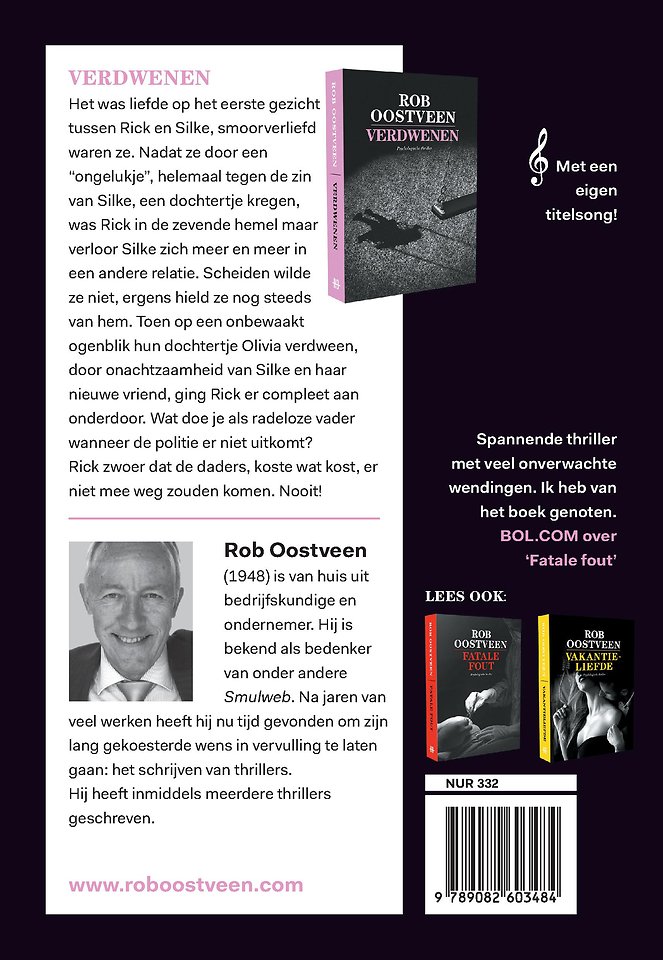 Rob Oostveen (1948) is van huis uit bedrijfskundige en ondernemer. Hij is bekend als bedenker van onder andere Smulweb. Na jaren van veel werken heeft hij nu tijd gevonden om zijn lang gekoesterde wens in vervulling te laten gaan: het schrijven van thrillers.
