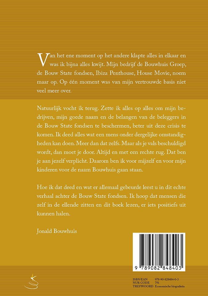 Natuurlijk vocht ik terug. Zette ik alles op alles om mijn bedrijven, mijn goede naam en de belangen van de beleggers in de Bouw State fondsen te beschermen, beter uit deze crisis te komen. Ik deed alles wat een mens onder dergelijke omstandigheden kan doen. Meer dan dat zelfs. Maar als je vals beschuldigd wordt, dan moet je door. Altijd en met een rechte rug. Dat ben je aan jezelf verplicht. Daarom ben ik voor mijzelf en voor mijn kinderen voor de naam Bouwhuis gaan staan.