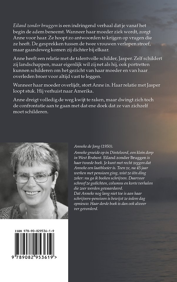 Anneke groeide op in Dinteloord, een klein dorp in West Brabant. Eiland zonder Bruggen is haar tweede boek. Je kunt met recht zeggen dat Anneke een laatbloeier is. Toen ze, na 45 jaar werken met pensioen ging, wist