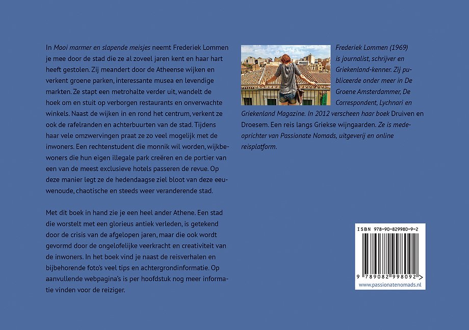 In 'Mooi marmer en slapende meisjes - dwars door Athene' neemt Frederiek Lommen je mee door de stad die ze al zoveel jaren kent en haar hart heeft gestolen. Zij meandert door de Atheense wijken en verkent groene parken, interessante musea en levendige markten. Ze stapt een metrohalte verder uit, wandelt de hoek om en stuit op verborgen restaurants en onverwachte winkels. Naast de wijken in en rond het centrum, verkent ze ook de rafelranden en achterbuurten van de stad. Tijdens haar vele omzwervingen praat ze zo veel mogelijk met de inwoners. Een rechtenstudent die monnik wil worden, wijkbewoners die hun eigen illegale park creëren en de portier van een van de meest exclusieve hotels passeren de revue. Op deze manier legt ze de hedendaagse ziel bloot van deze eeuwenoude, chaotische en steeds weer veranderende stad.