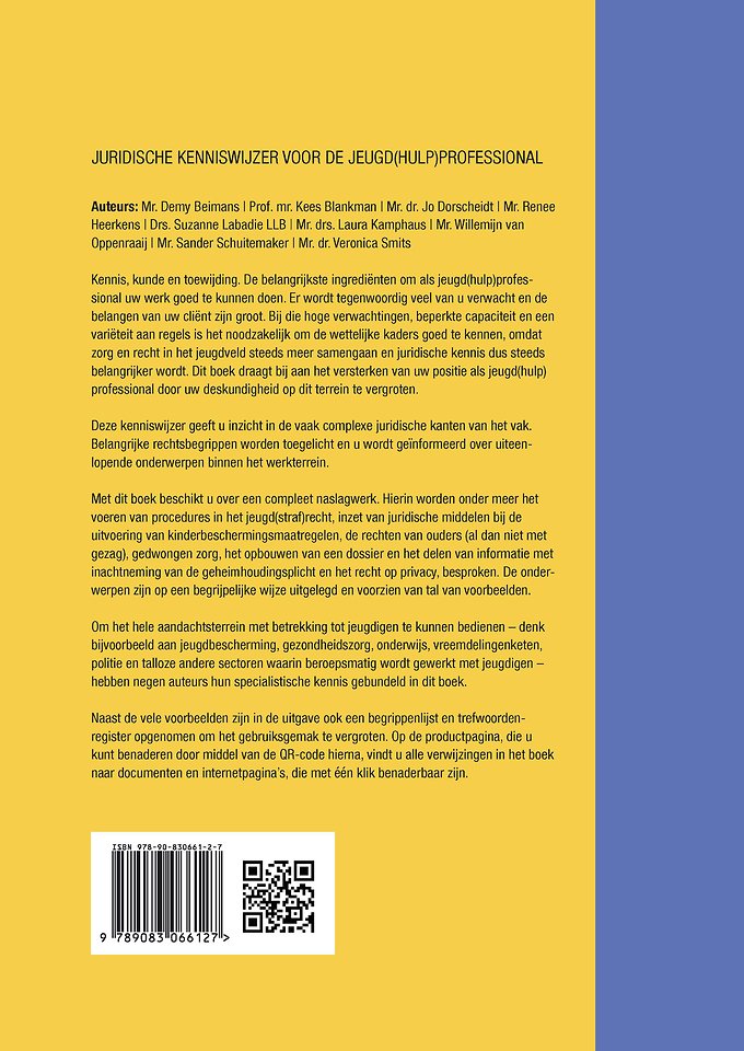 Om het hele aandachtsterrein met betrekking tot jeugdigen te kunnen bedienen – denk bijvoorbeeld aan jeugdbescherming, gezondheidszorg, onderwijs, vreemdelingenketen, politie en talloze andere sectoren waarin beroepsmatig wordt gewerkt met jeugdigen – hebben negen auteurs hun specialistische kennis gebundeld in dit boek. Naast de vele voorbeelden zijn in de uitgave ook een begrippenlijst en trefwoordenregister opgenomen om het gebruiksgemak te vergroten. Op de productpagina, die u kunt benaderen door middel van de QR-code, vindt u alle verwijzingen in het boek naar documenten en internetpagina’s, die met één klik benaderbaar zijn.