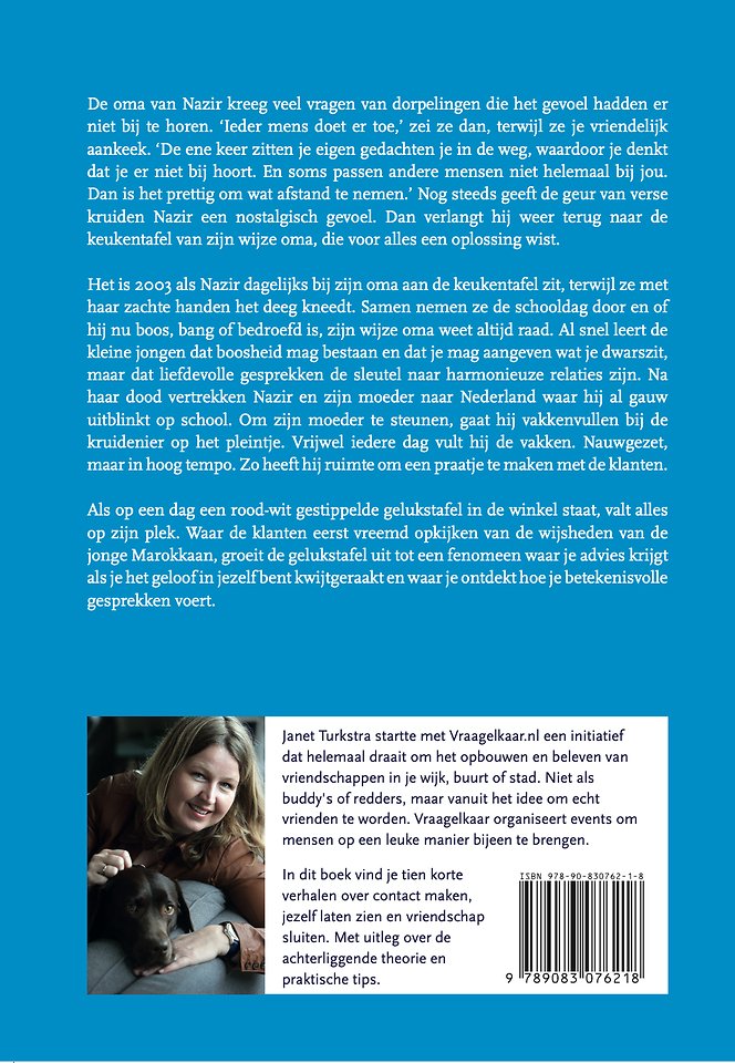Na haar dood vertrekken Nazir en zijn moeder naar Nederland waar hij al gauw uitblinkt op school. Om zijn moeder te steunen, gaat hij vakkenvullen bij de kruidenier op het pleintje. Vrijwel iedere dag vult hij de vakken. Nauwgezet, maar in hoog tempo. Zo heeft hij ruimte om een praatje te maken met de klanten. Als op een dag een rood-wit gestippelde gelukstafel in de winkel staat, valt alles op zijn plek. Waar de klanten eerst vreemd opkijken van de wijsheden van de jonge Marokkaan, groeit de gelukstafel uit tot een fenomeen waar je advies krijgt als je het geloof in jezelf bent kwijtgeraakt en waar je ontdekt hoe je betekenisvolle gesprekken voert.