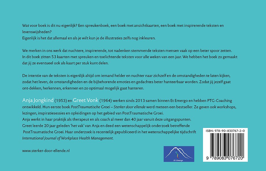 Anja Jongkind (1953) en Greet Vonk (1964) werken sinds 2013 samen binnen Et Emergo en hebben PTG-Coaching ontwikkeld. Hun eerste boek PostTraumatische Groei – Sterker door ellende werd meteen een bestseller. Ze geven ook workshops, lezingen, inspiratiesessies en opleidingen op het gebied van PostTraumatische Groei.