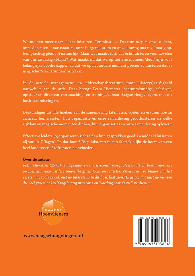 In de actuele management- en leiderschapsliteratuur komt luister(v)aardigheid nauwelijks aan de orde. Daar brengt Petra Hiemstra, bestuurskundige, schrijver, opleider en directeur van coaching- en trainingsbureau Haagse Hoogvliegers, met dit boek verandering in.