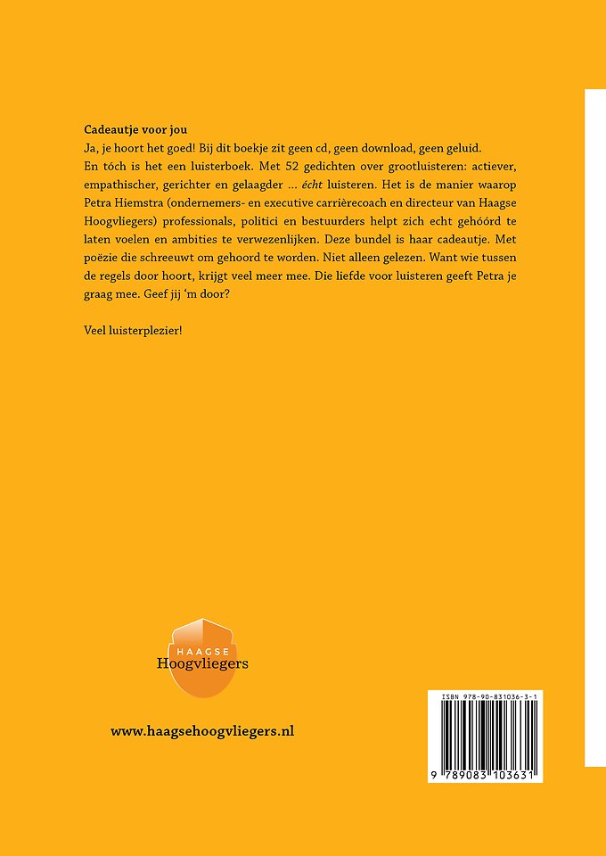 En tóch is het een luisterboek. Met 52 gedichten over grootluisteren: actiever, empathischer, gerichter en gelaagder … écht luisteren. Het is de manier waarop Petra Hiemstra (ondernemers- en executive carrièrecoach en directeur van Haagse Hoogvliegers) professionals, politici en bestuurders helpt zich echt gehóórd te laten voelen en ambities te verwezenlijken. Deze bundel is haar cadeautje. Met poëzie die schreeuwt om gehoord te worden. Niet alleen gelezen. Want wie tussen de regels door hoort, krijgt veel meer mee. Die liefde voor luisteren geeft Petra je graag mee. Geef jij ’m door?