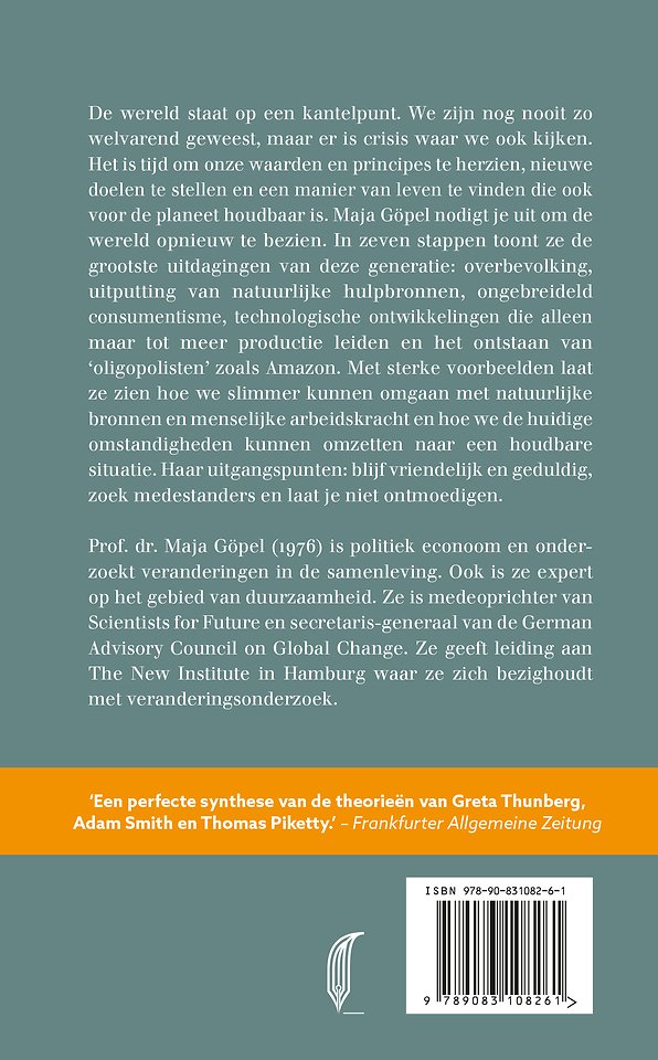 De wereld staat op een kantelpunt. We zijn nog nooit zo welvarend geweest, maar er is crisis waar we ook kijken. Het is tijd om onze waarden en principes te herzien, nieuwe doelen te stellen en een manier van leven te vinden die ook voor de planeet houdbaar is. Maja Göpel nodigt je uit om de wereld opnieuw te bezien.