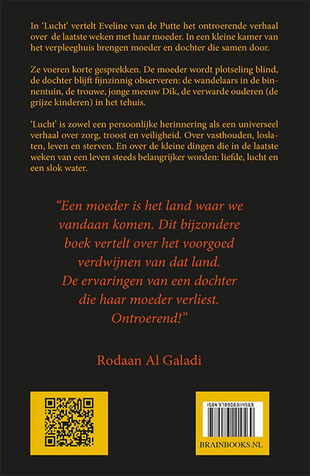 Lucht is zowel een persoonlijke herinnering als een universeel verhaal over zorg, troost en veiligheid. Over vasthouden, loslaten, leven en sterven. En over de kleine dingen die in de laatste weken van een leven steeds belangrijker worden: liefde, lucht en een slok water.