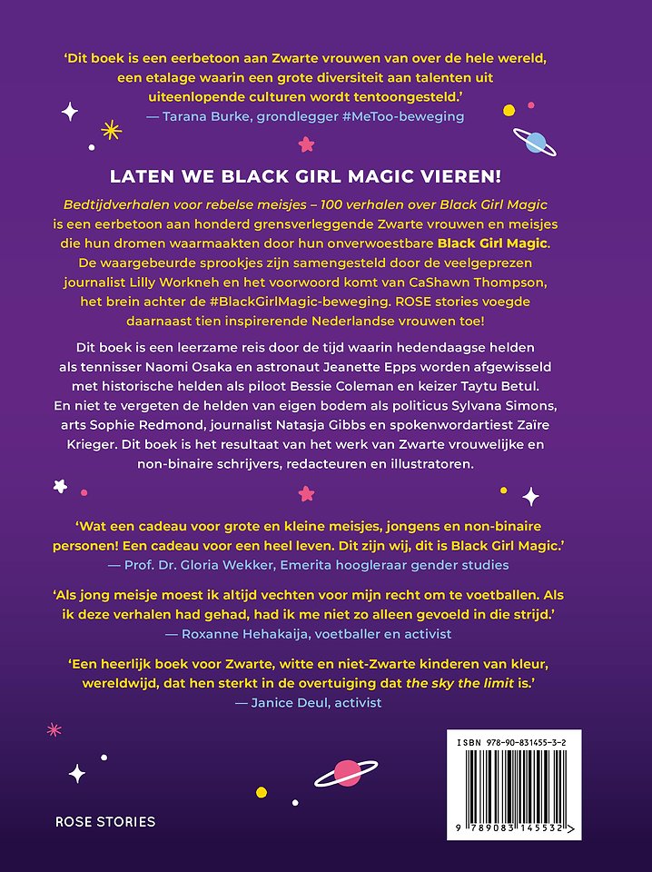 Bedtijdverhalen voor rebelse meisjes - 100 verhalen over Black Girl Magic is een eerbetoon aan 100 grensverleggende Zwarte vrouwen en meisjes die hun dromen waarmaakten door hun onverwoestbare Black Girl Magic. De waargebeurde sprookjes zijn samengesteld door de veelgeprezen journalist Lily Workneh en het voorwoord komt van CaShawn Thompson, het brein achter de #BlackGirlMagic-beweging. ROSE stories voegde daarnaast 10 inspirerende vrouwen toe!