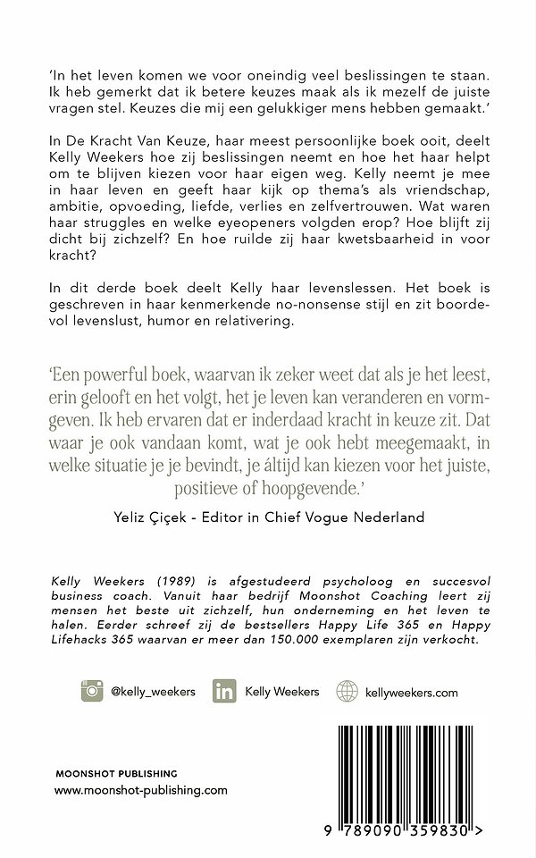 In 'De kracht van keuze', haar meest persoonlijke boek tot nu toe , neemt Kelly je mee in haar leven en deelt haar kijk op thema’s als vriendschap, ambitie, opvoeding, liefde, verlies en zelfvertrouwen. Het boek is geschreven in de typerende no no-nonsense stijl die we inmiddels van Kelly kennen en zit boordevol levenslust, humor en relativering.