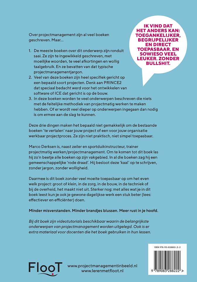 Daarmee is dit boek zonder veel moeite toepasbaar op om het even welk project: groot of klein, in de zorg, in de bouw, in de techniek of bij de overheid, het maakt niet uit. Sterker nog: met alles wat je in dit boek leest kun je ook je gewone dagelijkse werk een stuk beter (lees: effectiever en efficiënter) doen. Minder misverstanden. Minder brandjes blussen. Meer rust in je hoofd. Bij dit boek zijn videotutorials beschikbaar waarin de belangrijkste onderwerpen van projectmanagement worden uitgelegd. Ook is er extra materiaal voor docenten die het boek gebruiken in hun lessen.