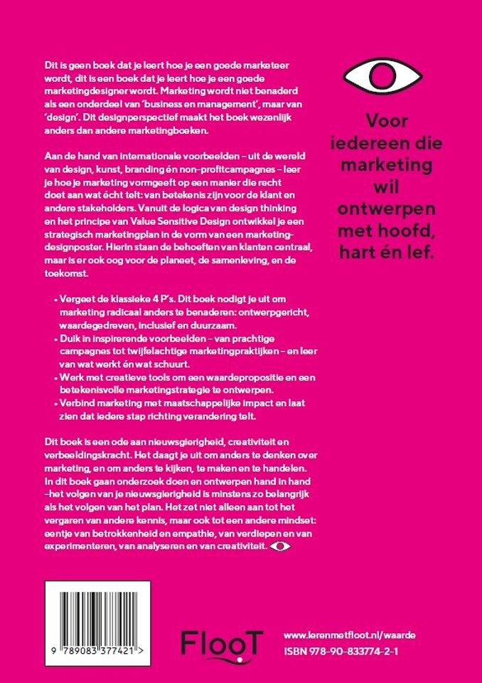 Dit is geen boek dat je leert hoe je een goede marketeer wordt, dit is een boek dat je leert hoe je een goede marketingdesigner wordt. Marketing wordt niet benaderd als een onderdeel van ‘business en management’, maar van ‘design’. Dit designperspectief maakt het boek wezenlijk anders dan andere marketingboeken.