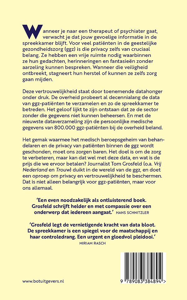 Het gemak waarmee het medisch beroepsgeheim van behandelaren en de privacy van patiënten binnen de ggz wordt geschonden, moet ons zorgen baren. Het doel is om de zorg te verbeteren, maar kan dat wel met deze data, en wat is de prijs die we ervoor betalen? Journalist Tom Grosfeld (o.a. Vrij Nederland en Trouw) duikt in de wereld van de ggz, en doet een oproep om privacy en vertrouwelijkheid te beschermen. Dat is niet alleen belangrijk voor ggz-patiënten, maar voor ons allemaal.
