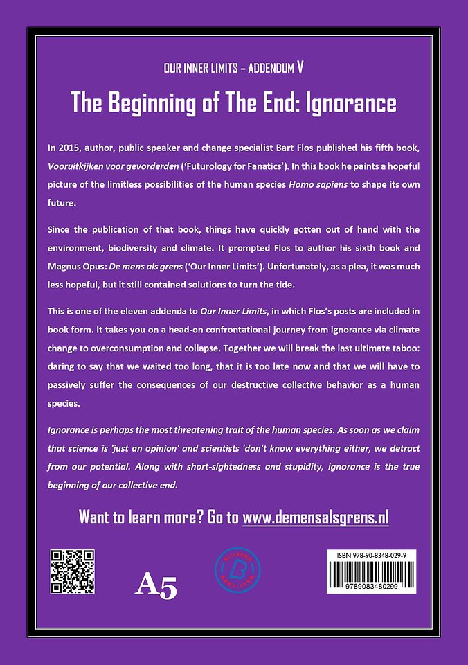 This is one of the eleven addenda to Our Inner Limits, in which Flos’s posts are included in book form. It takes you on a head-on confrontational journey from ignorance via climate change to overconsumption and collapse. Together we will break the last ultimate taboo: daring to say that we waited too long, that it is too late now and that we will have to passively suffer the consequences of our destructive collective behavior as a human species.