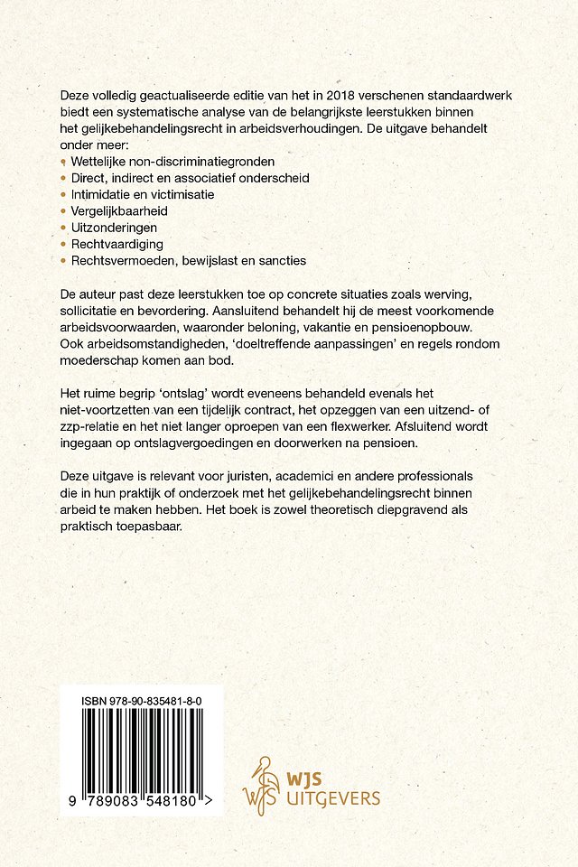 Deze volledig geactualiseerde editie van het in 2018 verschenen standaardwerk biedt een systematische analyse van de belangrijkste leerstukken binnen het gelijkebehandelingsrecht in arbeidsverhoudingen.