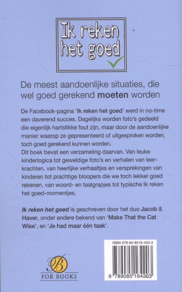 Dit boek bevat een verzameling daarvan. Van leuke kinderlogica, tot geweldige foto's en verhalen van leerkrachten, van heerlijke verhaaltjes en versprekingen van kinderen tot prachtige bloopers die we toch lekker goed rekenen, van woord- en taalgrapjes tot typische 'Ik reken het goed-momentjes'.Ik reken het goed is geschreven door het duo Jacob & Haver, onder andere bekend van 'Make That the Cat Wise', en 'Je had maar één taak'.