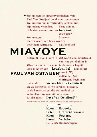 Miavoye is een liefdesverklaring aan Paul van Ostaijen, ons ‘Zot Polleke’. Deze nooit eerder uitgevoerde expeditie blaast de dode dichter nieuw leven in. En evenzeer is het een ontroerend reisverhaal van vier jongens die zich verwonderd in het midden van hun leven bevinden. Eindelijk is er dit troostrijke gebaar voor de poëzie, een melancholieke fuck you tegen de sterfelijkheid.
