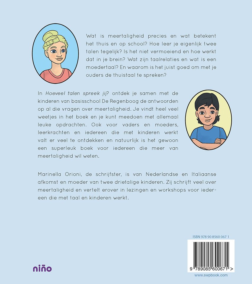 In 'Hoeveel talen spreek jij?' ontdek je samen met de kinderen van basisschool De Regenboog de antwoorden op al die vragen over meertaligheid. Je vindt heel veel weetjes in het boek en je kunt meedoen met allemaal leuke opdrachten. Ook voor vaders en moeders, leerkrachten en iedereen die met kinderen werkt valt er veel te ontdekken en natuurlijk is het gewoon een superleuk boek voor iedereen die meer van meertaligheid wil weten.