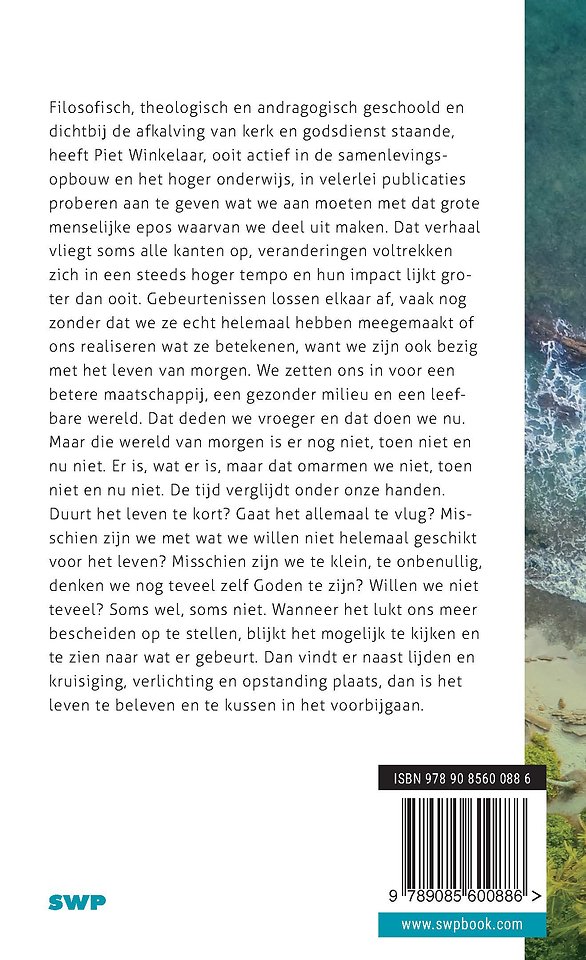 Filosofisch, theologisch en andragogisch geschoold en dichtbij de afkalving van kerk en godsdienst staande, heeft Piet Winkelaar, ooit actief in de samenlevingsopbouw en het hoger onderwijs, in velerlei publicaties proberen aan te geven wat we aan moeten met dat grote menselijke epos waarvan we deel uit maken. Dat verhaal vliegt soms alle kanten op, veranderingen voltrekken zich in een steeds hoger tempo en hun impact lijkt groter dan ooit. Gebeurtenissen lossen elkaar af, vaak nog zonder dat we ze echt helemaal hebben meegemaakt of ons realiseren wat ze betekenen, want we zijn ook bezig met het leven van morgen.