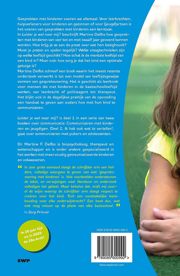 Gesprekken met kinderen voeren we allemaal. Voor leerkrachten, hulpverleners voor kinderen en gezinnen of voor (jeugd)artsen is het voeren van gesprekken met kinderen een kerntaak. In Luister je wel naar míj? beschrijft Martine Delfos hoe gesprekken met kinderen van vier tot en met twaalf jaar gevoerd kunnen worden.