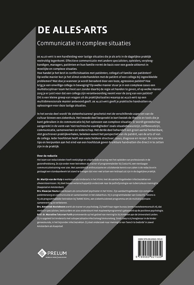 De alles-arts is een handleiding voor lastige situaties die je als arts in de dagelijkse praktijk veelvuldig tegenkomt. Effectieve communicatie met andere specialisten, opleiders, verpleegkundigen, managers, patiënten en hun familie vormt de basis voor een goede uitkomst in moeilijke en complexe situaties.