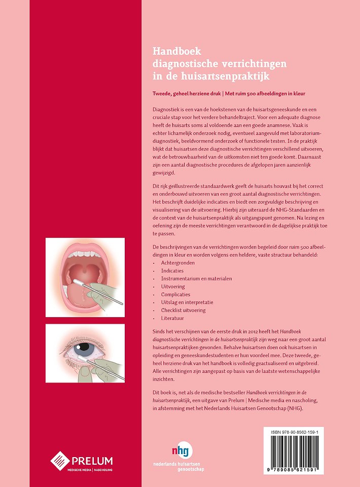 Dit rijk geïllustreerde standaardwerk geeft de huisarts houvast bij het correct en onderbouwd uitvoeren van een groot aantal diagnostische verrichtingen. Het beschrijft duidelijke indicaties en biedt een zorgvuldige beschrijving en visualisering van de uitvoering. Hierbij zijn uiteraard de NHG-Standaarden en de context van de huisartsenpraktijk als uitgangspunt genomen. Na lezing en oefening zijn de meeste verrichtingen verantwoord in de dagelijkse praktijk toe te passen.