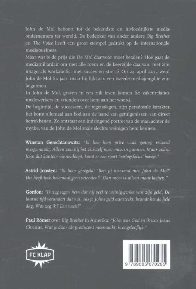 Naar aanleiding van de zestigste verjaardag van John de Mol interviewen we 60 mensen uit zijn directe omgeving en componeren een bijzonder boek over de mediatycoon. Hoewel hij zelf liever achter de schermen actief is, wordt zijn vakmanschap op het tv-scherm (Big Brother, The Voice) nationaal en internationaal geroemd. John de Mol is een fenomeen.
