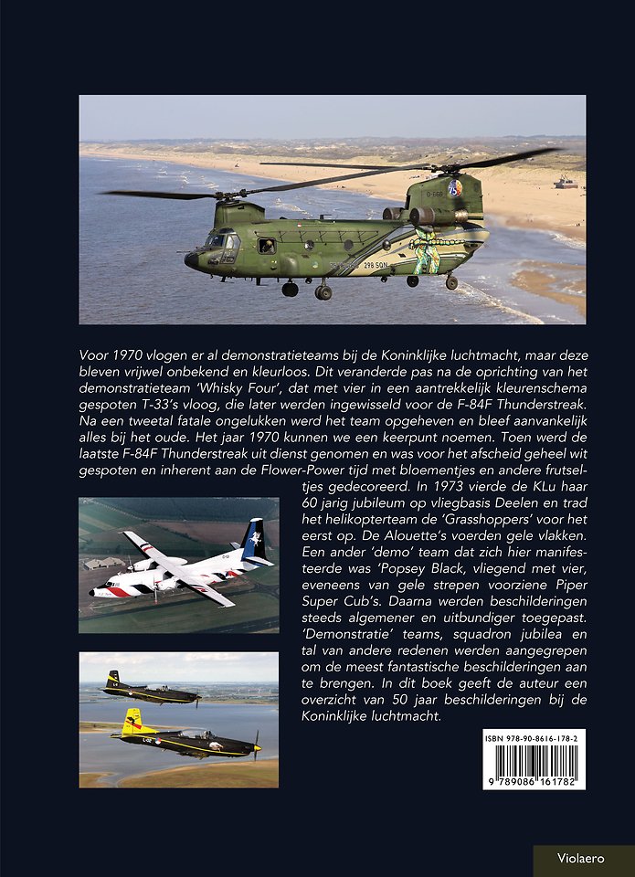 In 1973 vierde de KLu haar 60-jarig jubileum op vliegbasis Deelen en trad het helikopterteam de 'Grasshoppers' voor het eerst op. De Alouette's voerden gele vlakken. Een ander 'demo'-team dat zich hier manifesteerde was 'Popsey Black', vliegend met vier, eveneens van gele strepen voorziene Piper Super Cub's. Daarna werden beschilderingen steeds algemener en uitbundiger toegepast. 'Demonstratie'-teams, squadronjubileums en tal van andere redenen werden aangegrepen om de meest fantastische beschilderingen aan te brengen. In dit boek geeft de auteur een overzicht van 50 jaar beschilderingen bij de Koninklijke Luchtmacht.
