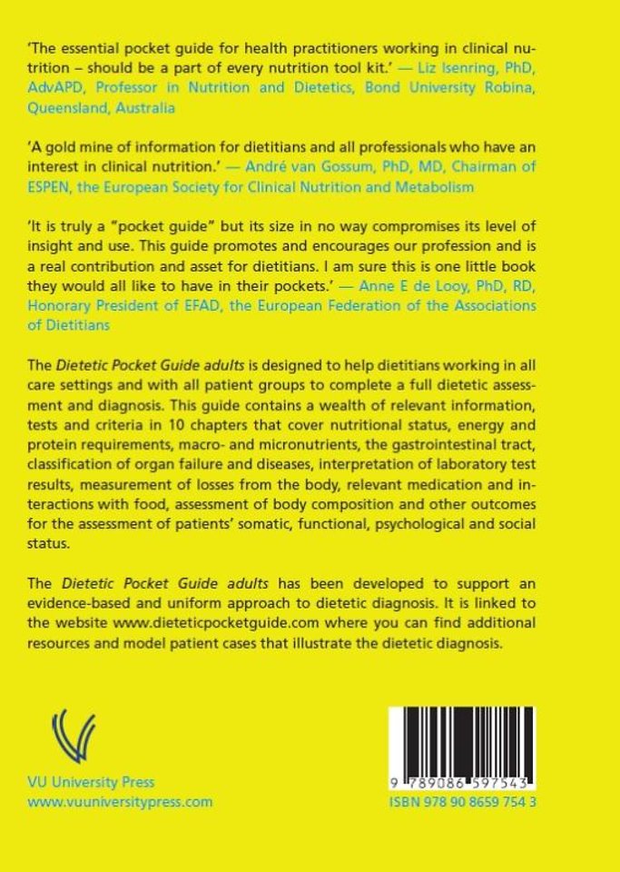 The Dietetic Pocket Guide adults is designed to help dietitians working in all care settings and with all patient groups to complete a full dietetic assessment and diagnosis. This guide contains a wealth of relevant information, tests and criteria in 10 chapters that cover nutritional status, energy and protein requirements, macro- and micronutrients, the gastrointestinal tract, classification of organ failure and diseases, interpretation of laboratory test results, measurement of losses from the body, relevant medication and interactions with food, assessment of body composition and other outcomes for the assessment of patients' somatic, functional, psychological and social status.