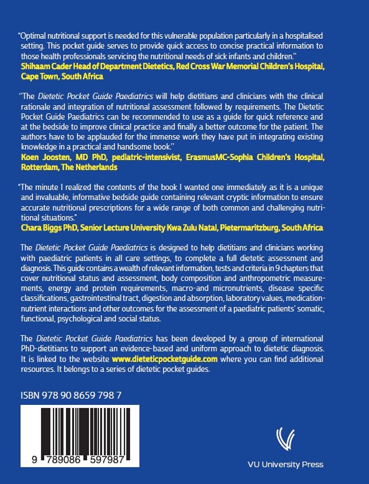 The Dietetic Pocket Guide Paediatrics is designed to help dietitians and clinicians working with paediatric patients in all care settings, to complete a full dietetic assessment and diagnosis. This guide contains a wealth of relevant information, tests and criteria in 9 chapters that cover nutritional status and assessment, body composition and anthropometric measurements, energy and protein requirements, macro-and micronutrients, disease specific classifications, gastrointestinal tract, digestion and absorption, laboratory values, medicationnutrient interactions and other outcomes for the assessment of a paediatric patients’ somatic, functional, psychological and social status.