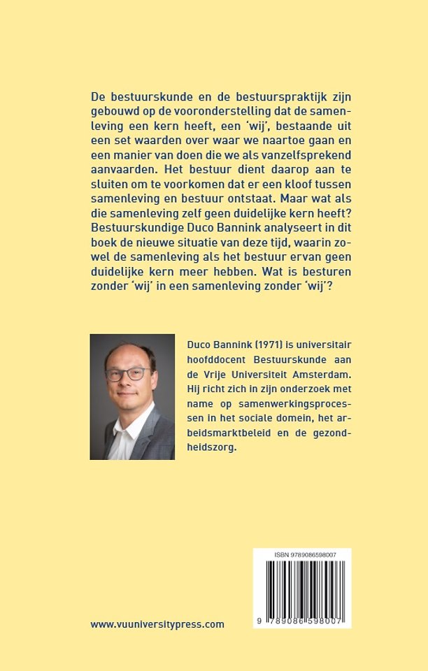Het bestuur dient daarop aan te sluiten om te voorkomen dat er een kloof tussen samenleving en bestuur ontstaat. Maar wat als die samenleving zelf een duidelijke kern heeft? Bestuurskundige Duco Bannink analyseert in dit boek de nieuwe situatie van deze tijd, waarin zowel de samenleving als het bestuur ervan geen duidelijke kern meer hebben. Wat is besturen zonder 'wij' in een samenleving zonder 'wij'?