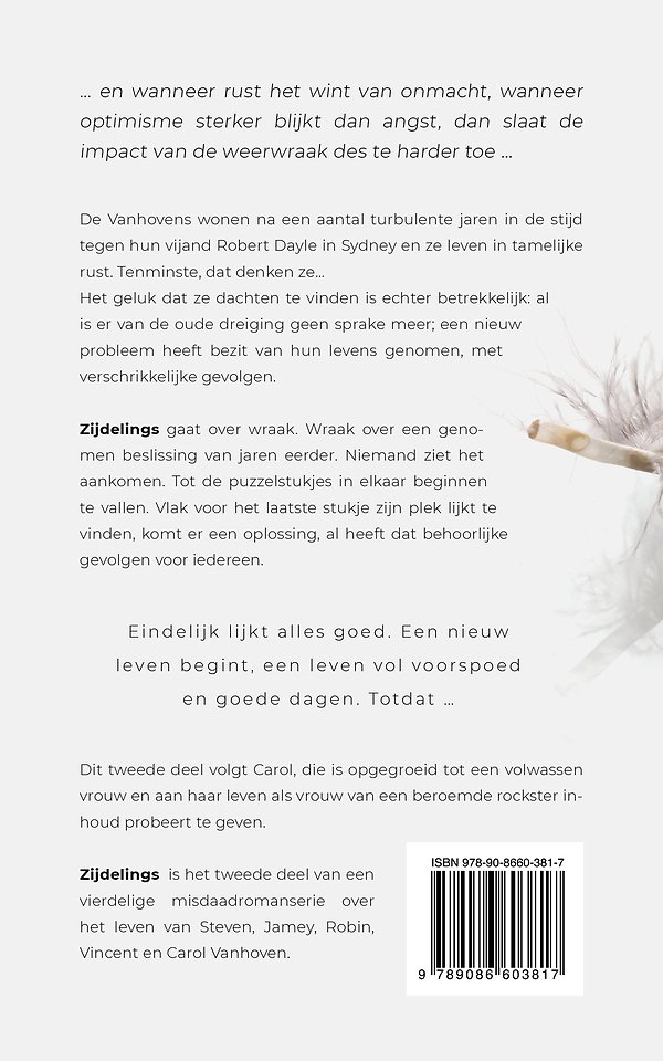 Zijdelings is het tweede deel van een vierdelige misdaadromanserie over het leven van Steven, Jamey, Robin, Vincent en Carol Vanhoven.