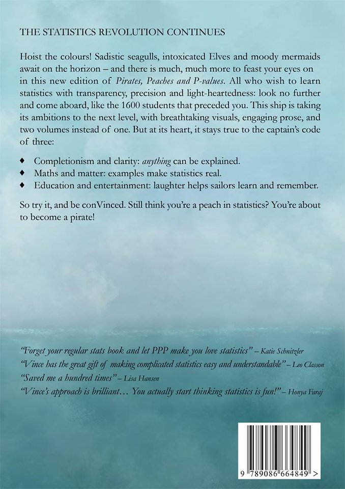 Hoist the colours! Sadistic seagulls, intoxicated Elves and moody mermaids await on the horizon – and there is much, much more to feast your eyes on in this new edition of Pirates, Peaches and P-values. All who wish to learn statistics with transparency, precision and light-heartedness: look no further and come aboard, like the 1600 students that preceded you. This ship is taking its ambitions to the next level, with breathtaking visuals, engaging prose, and two volumes instead of one. But at its heart, it stays true to the captain’s code of three: