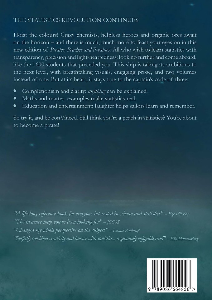 Hoist the colours! Crazy chemists, helpless heroes and organic orcs await on the horizon – and there is much, much more to feast your eyes on in this new edition of Pirates, Peaches and P-values. All who wish to learn statistics with transparency, precision and light-heartedness: look no further and come aboard, like the 1600 students that preceded you. This ship is taking its ambitions to the next level, with breathtaking visuals, engaging prose, and two volumes instead of one. But at its heart, it stays true to the captain’s code of three: