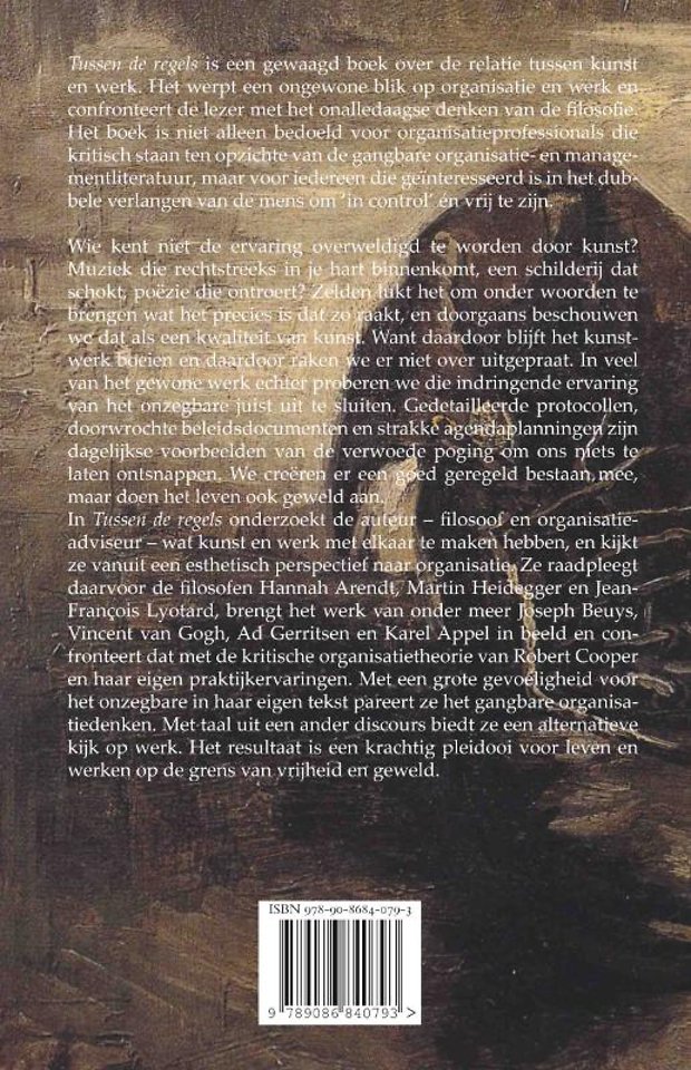 In 'Tussen de regels' onderzoekt de auteur - filosoof en organisatieadviseur - wat kunst en werk met elkaar te maken hebben, en kijkt ze vanuit een esthetisch perspectief naar organisatie. Ze raadpleegt daarvoor de filosofen Hannah Arendt, Martin Heidegger en Jean-François Lyotard, brengt het werk van onder meer Joseph Beuys, Vincent van Gogh, Ad Gerritsen en Karel Appel in beeld en confronteert dat met de kritische organisatietheorie van Robert Cooper en haar eigen praktijkervaringen.