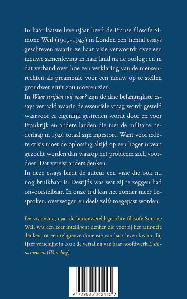 De visionaire, naar de buitenwereld gerichte filosofe Simone Weil was een zeer intelligent denker die voorbij het rationele denken tot een religieuze dimensie van haar leven kwam. Bij IJzer verscheen ook de vertaling van haar hoofdwerk L’Enracinement (Verworteling) en de essaybundel Over Oorlog (En het probleem van motivatie in crisistijd).