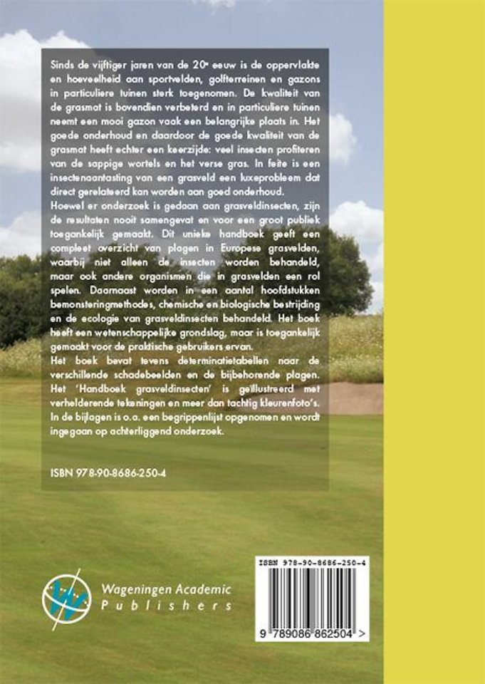 Dit unieke handboek geeft een compleet overzicht van plagen in Europese grasvelden, waarbij niet alleen de insecten worden behandeld, maar ook andere organismen die in grasvelden een rol spelen. Het `Handboek grasveldinsecten is geïllustreerd met verhelderende tekeningen en meer dan tachtig kleurenfotos. In de bijlagen is o.a. een begrippenlijst opgenomen en wordt ingegaan op achterliggend onderzoek. Het boek bevat tevens determinatietabellen naar de verschillende schadebeelden en de bijbehorende plagen. Daarnaast worden in een aantal hoofdstukken bemonsteringmethodes, chemische en biologische bestrijding en de ecologie van grasveldinsecten behandeld. Hoewel er onderzoek is gedaan aan grasveldinsecten, zijn de resultaten nooit samengevat en voor een groot publiek toegankelijk gemaakt.
