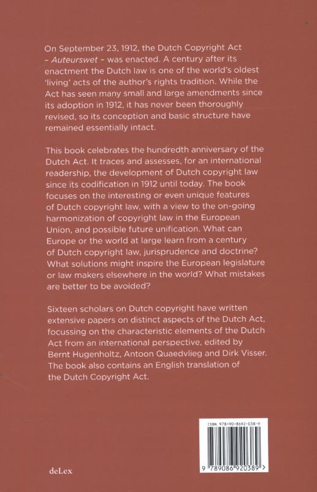 This book celebrates the hundredth anniversary of the Dutch Act. It traces and assesses, for an international readership, the development of Dutch copyright law since its codification in 1912 until today. The book focuses on the interesting or even unique features of Dutch copyright law, with a view to the on-going harmonization of copyright law in the European Union, and possible future unification. What can Europe or the world at large learn from a century of Dutch copyright law, jurisprudence and doctrine? What solutions might inspire the European legislature or law makers elsewhere in the world? What mistakes are better to be avoided?