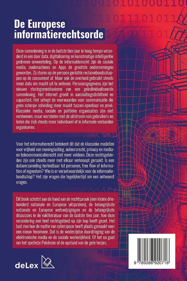 Dit boek schetst aan de hand van de rechtspraak (een kleine driehonderd nationale en Europese uitspraken), de belangrijkste nationale en Europese wetswijzigingen en de belangrijkste discussies in de vakliteratuur van de laatste tien jaar, hoe deze verandering een heel rechtsgebied op zijn kop heeft gezet. Het laat zien hoe de mythe van cyberspace heeft plaats gemaakt voor een nieuw fenomeen. Dat is de wederzijdse doordringing van de elektronische media en de sociale werkelijkheid. Of het nu gaat om het spelletje Pokémon of de opstand van de gele hesjes.