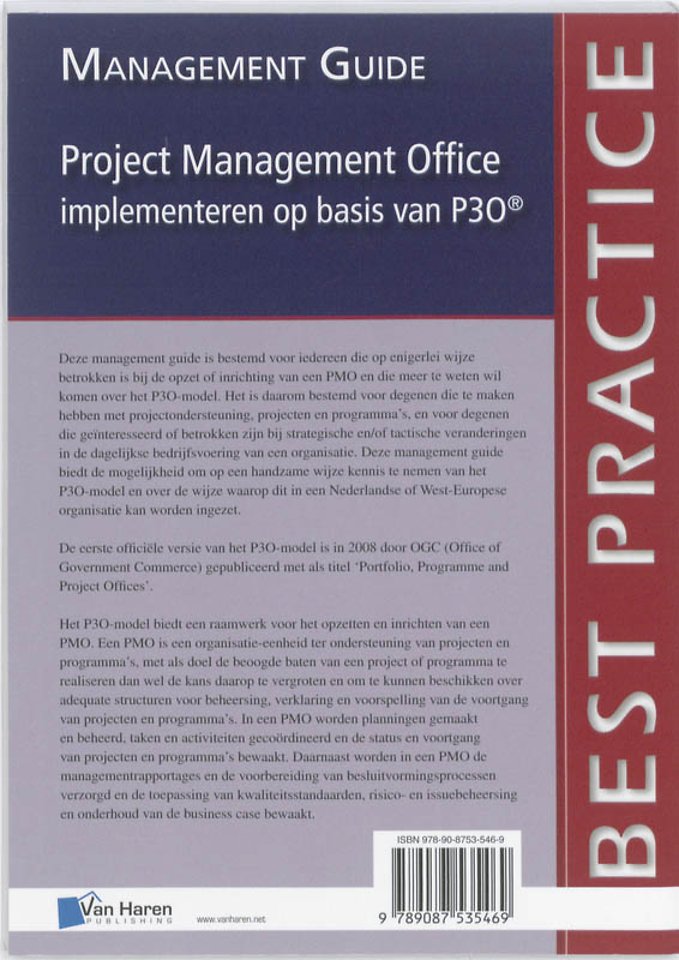 Deze management guide is bestemd voor iedereen die op enigerlei wijze betrokken is bij de opzet of inrichting van een PMO en die meer te weten wil komen over het P3O-model. Het is daarom bestemd voor degenen die te maken hebben met projectondersteuning, projecten en programma's, en voor degenen die geïnteresseerd of betrokken zijn bij strategische en/of tactische veranderingen in de dagelijkse bedrijfsvoering van een organisatie. Dit boek biedt de mogelijkheid om op een handzame wijze kennis te nemen van het P3O-model en over de wijze waarop dit in een Nederlandse of West-Europese organisatie kan worden ingezet.