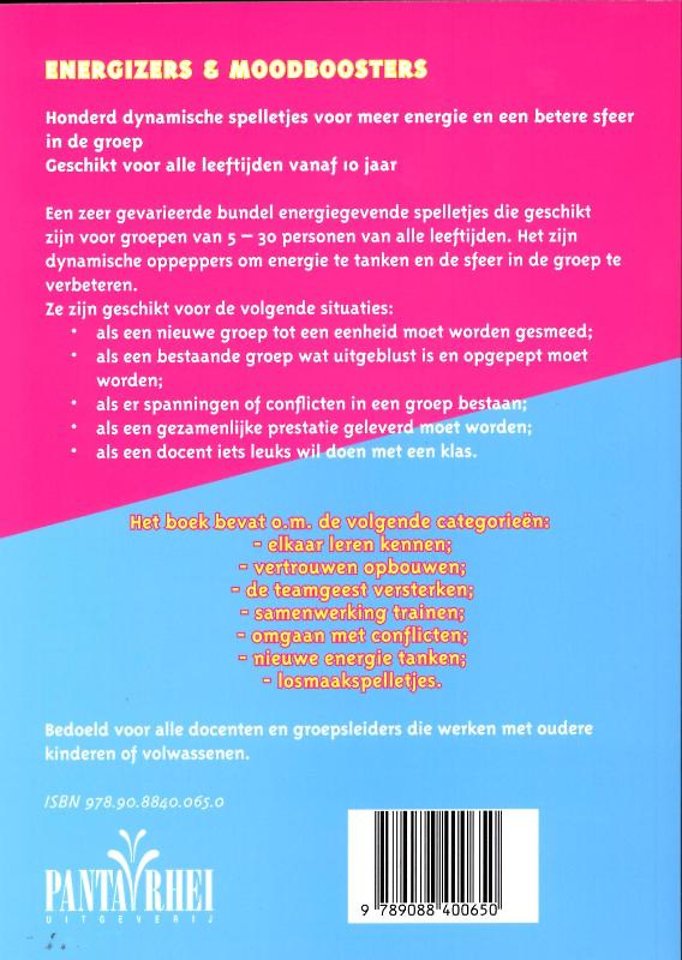 Een zeer gevarieerde bundel energie-gevende spelletjes die geschikt zijn voor groepen van 5 - 30 personen van alle leeftijden. Het zijn dynamische oppeppers om energie te tanken en de sfeer in de groep te verbeteren.