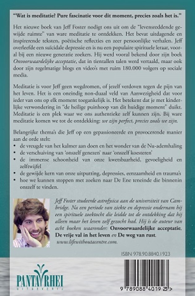 Het nieuwe boek van Jeff Foster nodigt ons uit om de “levensreddende gewijde ruimte” van ware meditatie te ontdekken. Het bevat uitdagende en inspirerende teksten, poëtische reflecties en zeer persoonlijke verhalen. Jeff overleefde een suïcidale depressie en is nu een populaire spirituele leraar, vooral bij een nieuwe generatie zoekers. Hij werd vooral bekend door zijn boek Onvoorwaardelijke acceptatie, dat in tientallen talen werd vertaald, maar ook door zijn regelmatige blogs en video’s met ruim 180.000 volgers op sociale media.