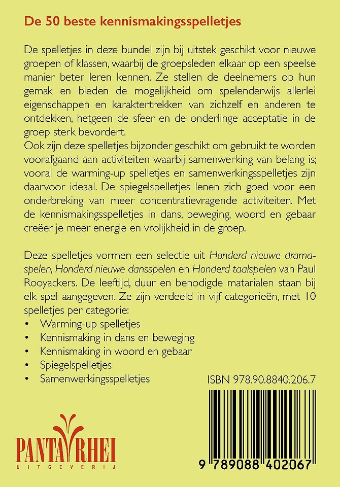 Deze spelletjes vormen een selectie uit 'Honderd nieuwe dramaspelen', 'Honderd nieuwe dansspelen' en 'Honderd taalspelen' van Paul Rooyackers. De leeftijd, duur en benodigde materialen staan bij elk spel aangegeven.