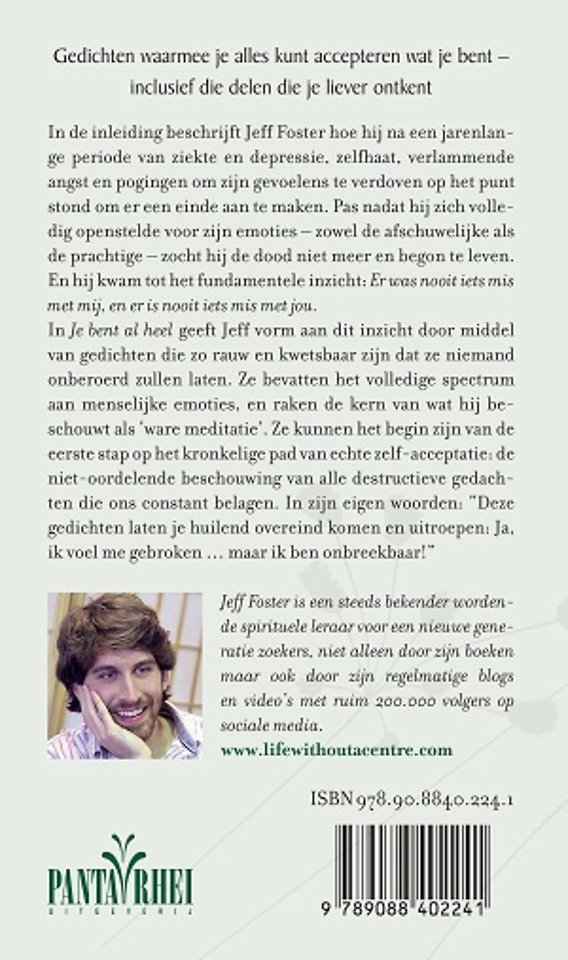 In Je bent al heel geeft Jeff vorm aan dit inzicht door middel van gedichten die zo rauw en kwetsbaar zijn dat ze niemand onberoerd zullen laten. Ze bevatten het volledige spectrum aan menselijke emoties, en raken de kern van wat hij beschouwt als ‘ware meditatie’. Ze kunnen het begin zijn van de eerste stap op het kronkelige pad van echte zelf-acceptatie: de niet-oordelende beschouwing van alle destructieve gedachten die ons constant belagen. In zijn eigen woorden: “Deze gedichten laten je huilend overeind komen en uitroepen: Ja, ik voel me gebroken … maar ik ben onbreekbaar!”